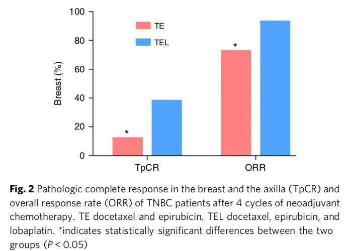 研究結果顯示:多西他賽和表柔比星方案中加入洛鉑作為TNBC的新輔助化療方案與多西他賽和表柔比星方案相比高顯著提高了TpCR率和ORR,毒性可以耐受; 短期來看還可以減少復發和轉移率。